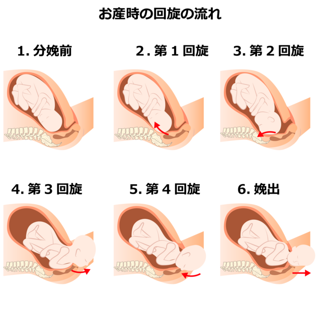意外と知られていないのですが、赤ちゃんは通常体を少しずつ回転させながら狭い骨盤を通り抜けます。